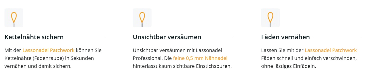 Die „Patchwork“ Nähnadel 1 mm und 0,5 mm sind für textile Arbeiten gedacht, bei denen häufig lose Fäden vernäht werden müssen. Entdecken Sie, wie man mit Zwei Fingern den Faden greift und vernäht. Aber auch dickere Fäden lassen sich damit gut verarbeiten. Für Stickarbeiten und die Verarbeitung mit Wolle gibt es jetzt auch eine Lassonadel Sticknadel mit stumpfer Spitze. Die Lassonadel wird komplett in Deutschland hergestellt und ist ein neues hochwertiges Werkzeug zum Nähen, Patchworken, Quilten, Sticken, Perlen aufreihen …