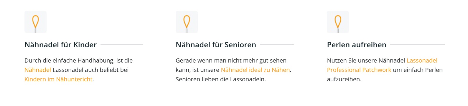 Lassonadel ist die neue Nähnadel mit eingebauter Einfädelhilfe für Näharbeiten jeder Art. Mit der Lassonadel können Sie im Handumdrehen einen Faden einfädeln und losnähen. Dabei geht man mit dem Fadenende einfach durch die 15 mm große Lassoschlaufe der Nähnadel.