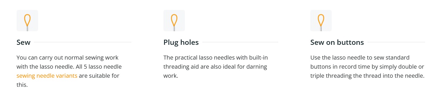 Lasso Needle is the new sewing needle with a built-in threading aid for all types of sewing work. With the Lasso Needle, you can thread a needle in no time at all and start sewing. Simply pass the end of the thread through the 15 mm lasso loop on the sewing needle.
