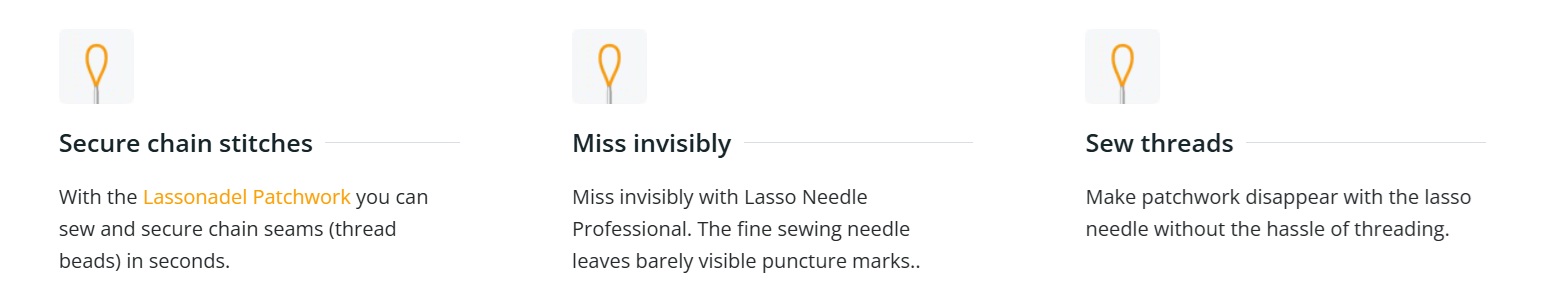 The 1 mm and 0.5 mm "Patchwork" sewing needles are designed for textile work that often requires sewing loose threads. Discover how to grasp and sew the thread with two fingers. Thicker threads can also be worked with easily. For embroidery and working with wool, there is now also a Lasso needle embroidery needle with a blunt tip. The Lasso needle is manufactured entirely in Germany and is a new high-quality tool for sewing, patchwork, quilting, embroidery, stringing beads, etc.