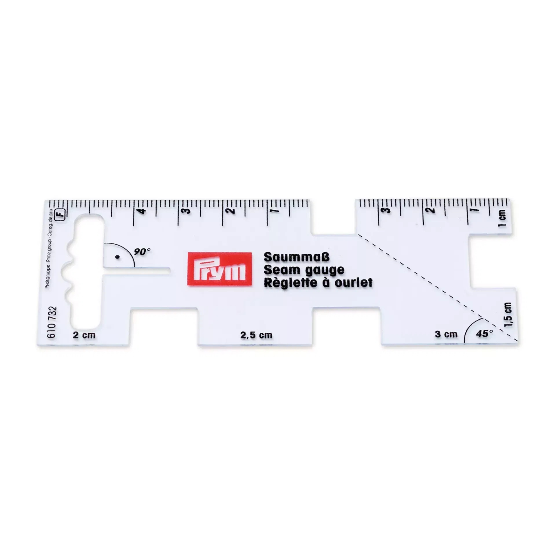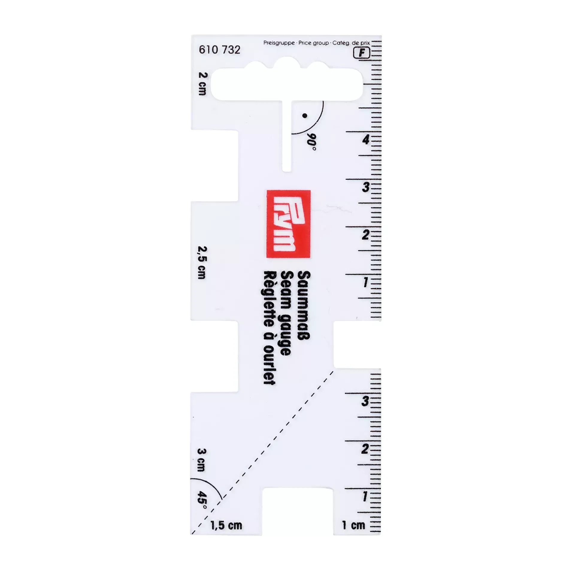 Das Saummaß von Prym ist ein weiterer praktischer Helfer in der Palette der Handmaße aus flexiblem Kunststoff. Dabei spielt es keine Rolle wie dick der Stoff ist und wie breit der Saum sein soll. Durch seine in mehreren Größen gestaffelten Einkerbungen von 1 cm bis 3,5 cm ist das Anzeichnen von Säumen ein Kinderspiel. Darüber hinaus verfügt das Saummaß über Winkelmarkierungen von 45 Grad und von 90 Grad. Damit können auch knifflige Säume und Briefecken problemlos gemeistert werden. Auch Knopflöcher für Hemden und Blusen lassen sich mit dem Saummaß aus transparentem Kunststoff ganz einfach anzeichnen.